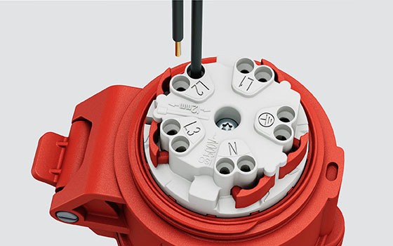 As tomadas de parede e de superfície MENNEKES em 16 e 32 A estão disponíveis com terminais com mola sem parafusos TwinCONTACT, particularmente economizadora de tempo. Aqui retira-se o isolamento dos condutores e depois inserimo-los na tomada sem quaisquer ferramentas. Os terminais duplos codificados asseguram a ligação correta e fixa dos condutores. Se quiser soltar um condutor de novo, prima o botão de desbloqueio vermelho – e pode simplesmente puxar o condutor para fora.