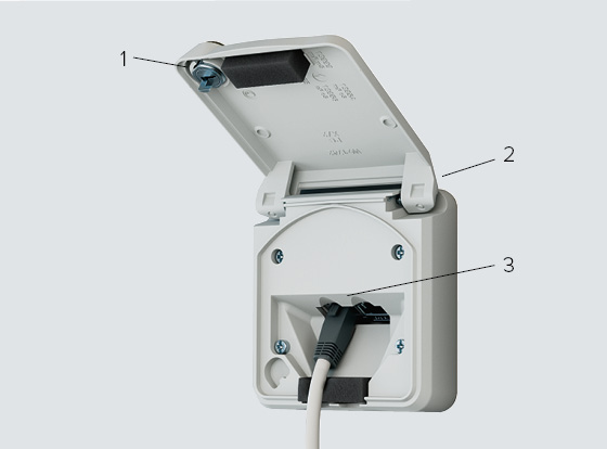 O amplo espaço de ligação oferece lugar para cabos de alimentação até 6 mm². A parte inferior pode ser rodada em 180°, permitindo a entrada do cabo por baixo sem trabalho adicional. O grau de proteção IP54 (protegido contra corpos estranhos e projeções de água) torna as tomadas de superfície seguras para uma grande variedade de aplicações. Membranas adicionais estão disponíveis no interior da caixa.