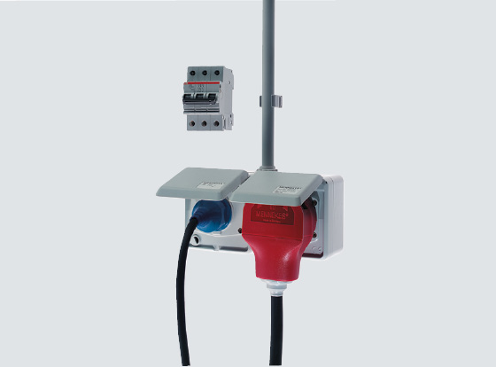 Uma combinação de tomadas frequentemente escolhida: CEE 16 A e SCHUKO®. Ao ligar esta combinação através de uma única linha de alimentação, é obrigatório utilizar um disjuntor de proteção de 3 polos.